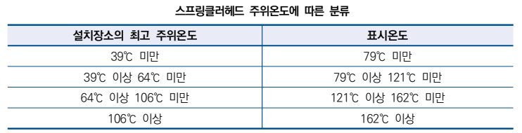③ 주위온도에 따른 분류 : 폐쇄형 스프링클러헤드는 그 설치장소의 평상시 최고주위 온도에 따라 아래의 표에 따른 표시