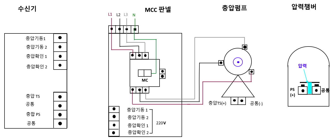 이렇게 하면 수신기, 충압펌프 MCC판넬, 충압펌프, 압력챔버간 결선이 된다.