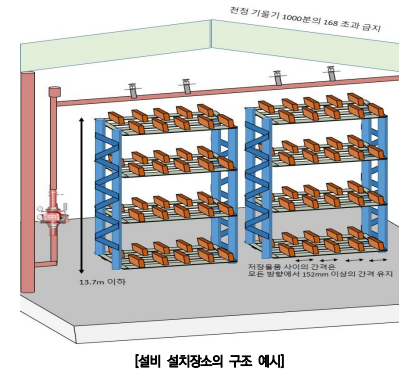 ① 화염속도가 빠르고 방사된 물이 하부까지에 도달하지 못하는 물품저장 ∙ 타이어, 두루마리 종이 및 섬유류,