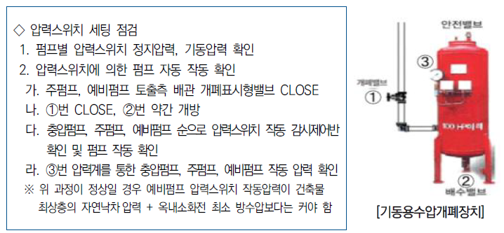 ➃ 기동용수압개폐장치의 압력스위치 설정 정상 여부 확인