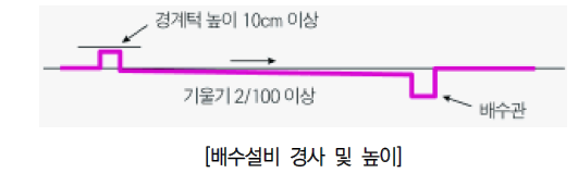 ➀ 배수설비의 경사 기울기 2/100 이상, 경계턱의 높이 10㎝ 이상 여부 확인