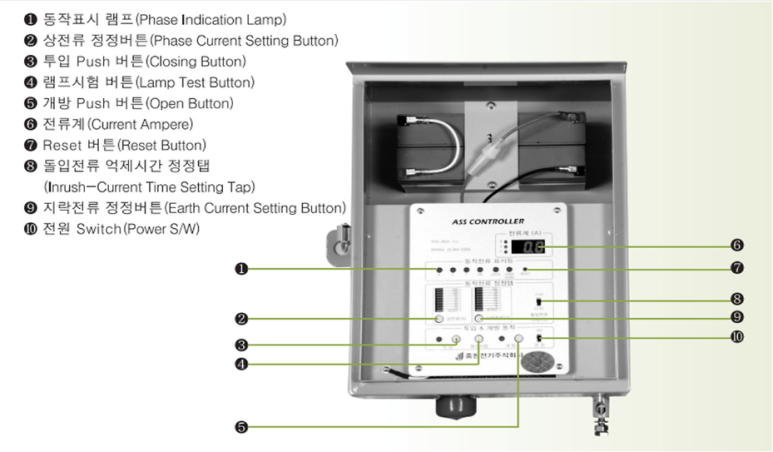 ②,⑨번의 지락전류 정정버튼과 상전류 정정버튼이 있다. 지락과 상간단락이 발생했을 때 차단해 주는 역할을 한다. 간혹 고장구간자동개폐기의 제어함이 고장 나서 교체한 후에 지락전류와 상전류를 설정해 주지 않고 놔두는 경우가 있다. 따라서 ASS 제어함을 볼 때 항상 지락전류와 상전류가 설정되어 있는지 확인해야 한다.