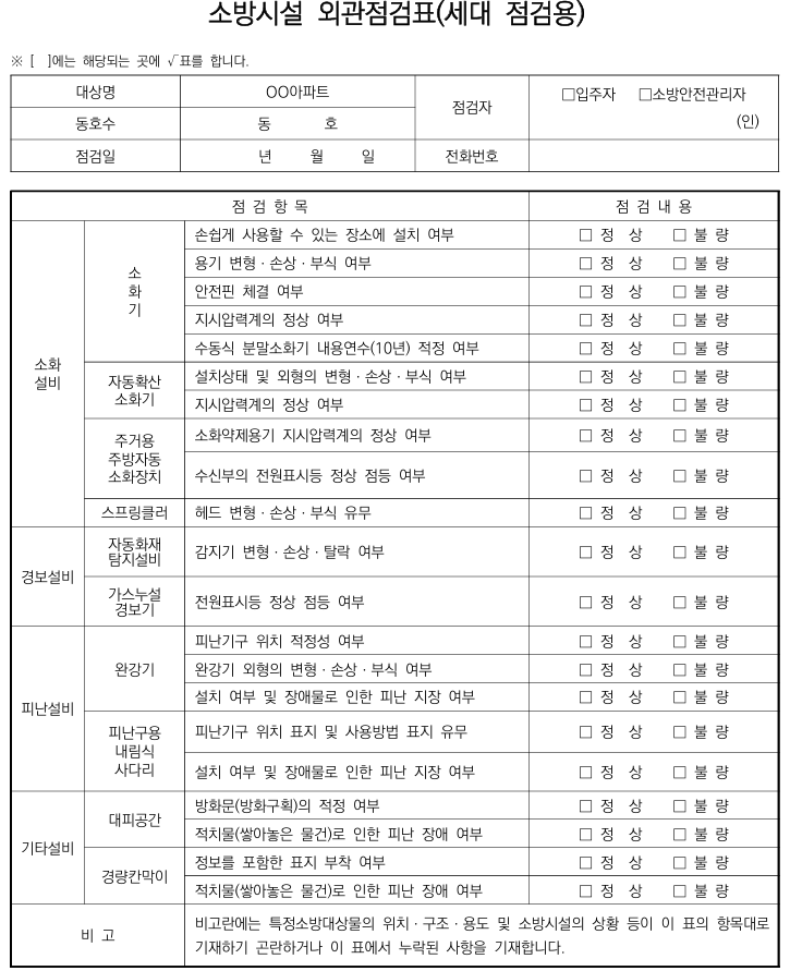 * 「소방시설법 시행규칙」[별표 3] 제6호 바목에 따라 관리자가 사전 파악한 세대점검 일정에 따라 점검한 후 그 결과를 정리한