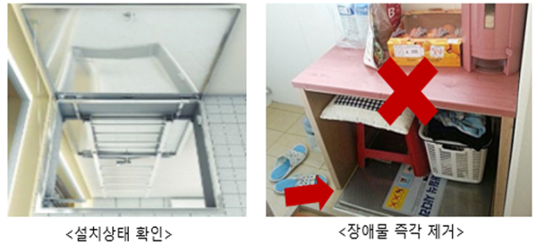 - 피난사다리의 설치 상태 확인하고 장애물을 제거한다.