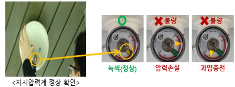 - 지시압력계는 게이지가 정상(녹색)에 위치하는지 확인한다.