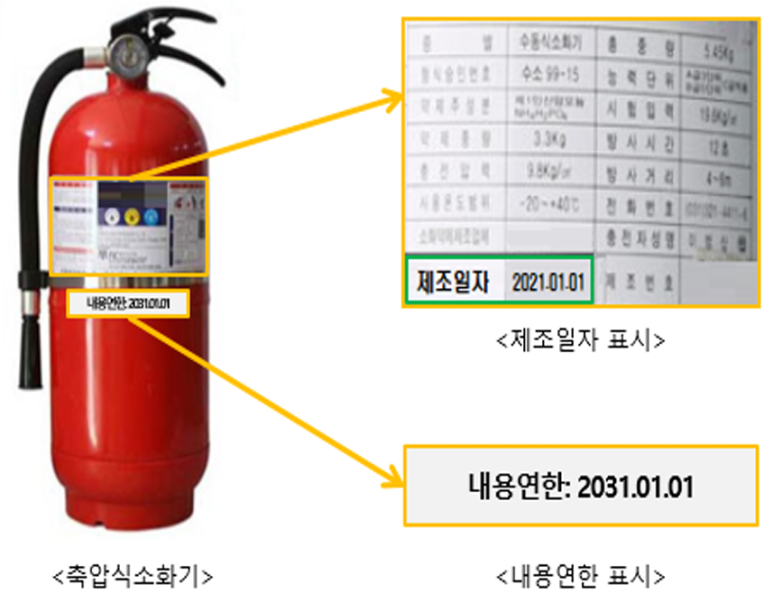 - 변형, 손상, 부식된 소화기는 전문가(소방시설점검업체, 공동주택 소방안전관리자 등) 의 점검 후 새 것으로 교체한다.