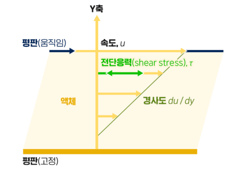 정의) 전단응력은 속도구배(속도기울기)에 비례하고, 이 속도기울기를 작게 하는 방향으로 전단응력이 작용합니다.
