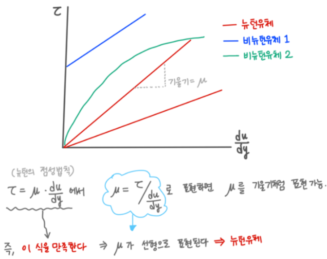 τ에 대한 관계식을 만족하는, 즉 전단응력 τ와 속도구배 du/dy가 선형인 유체를 뉴턴유체라 한다.