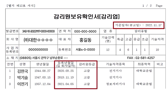 - 다만, 감리업자가 미리 발주자 (시 · 도지사)의 승인을 얻는다면, 입찰공고 당시 참여전력기술인 등의 평가요소(등급, 경력, 실적)