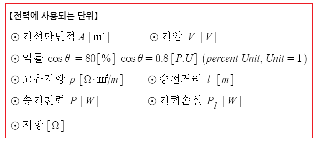 전력산정식에서 사용되는 요소별 단위는 다음과 같다.