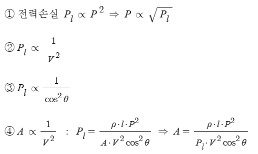 1. 전선단면적은 A ∝ 1/V2 한다. (전압의 제곱에 반비례한다)