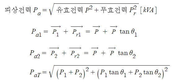 15. 한대의 주상변압기에 역률이 cosΘ1 유효전력 P1 부하와 역률이 cosΘ2 유효전력 P2 부하가