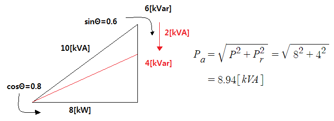 9. 피상전력이 P[kVA], 부하역률이 cosΘ인 부하를 역률 100[%]로 개선하기 위한