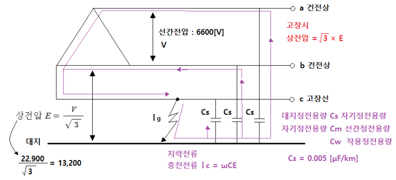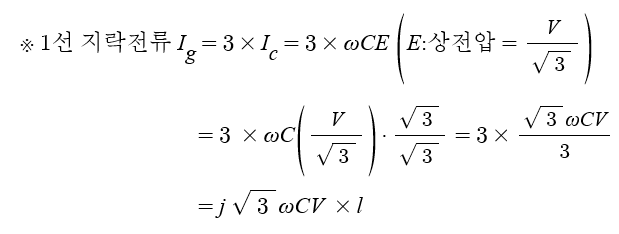 ※ 1선 지락전류 앞에 복소수 j가 붙는 것은 지락전류는 정전용량을 통하여 흐르게 되므로