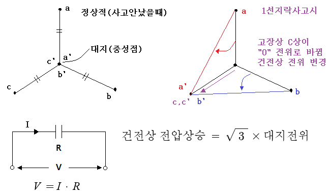 따라서 건전상의 전위는 고장전 전위보다 √3배 상승하게 된다. 이는 1선 지락사고가