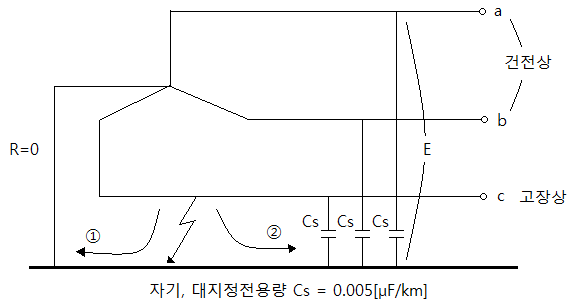 1선지락 사고가 발생했을 때에는 전류는 대지정전용량을 통하여 흐르지 못하고