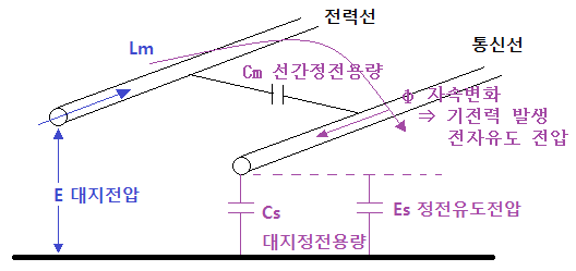 ※ 정전유도장해는 전력선과 통신선이 상호정전용량 Cm에 의하여 발생하게 되며