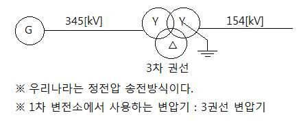 1차 변전소의 3권선 변압기의 결선방식은 Y-Y-△로 결선하며 △ 결선을 안정권선이라 한다.