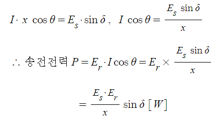 이는 송전전력 Es · sinδ 값과 같게 된다. 즉 I·X cosΘ = Es · sinδ 가 된다.