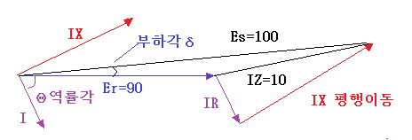 위 벡터도에서 r은 미미하므로 제거하면 Z=jX가 되므로 송전 전압강하 IZ=IX로