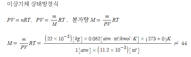 2. 표준상태 11.2[ℓ]의 기체질량이 22[g] 이었다면 이 기체의 분자량은 얼마인가 ? ③