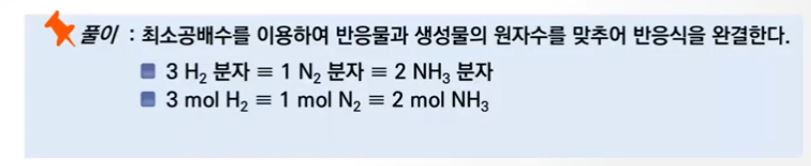 [예제] 수소(H2)와 질소 (N2)가 결합하여 암모니아(NH3)를 생성하는 화학반응식을 완결 하시오.