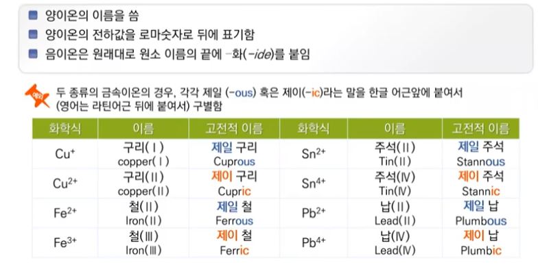 따라서 이름을 붙일 때 구리도 (+1)이 있고 (+2)가 있어서 화학자 들이 약속하기를