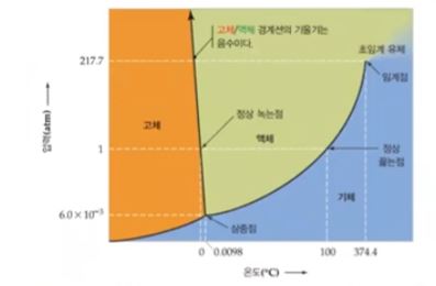 ※ 물의 고체 - 액체의 기울기가 음수라는 것은 압력을 높여 주면 녹는 점이 낮아지는데