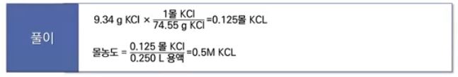 예제) 9.3[g]의 KCl를 충분한 물에 녹여 250[mℓ]의 용액을 만들었을 때 이 용액의 몰농