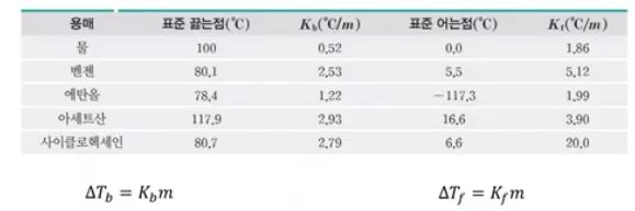 다. 일반적인 용매의 끓는 점 오름 상수와 어느 점 내림 상수