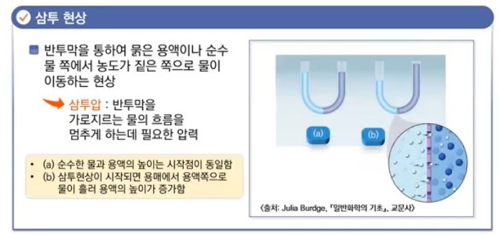 ▣ 삼투압 현상은 반투막을 통해서 묽은 용액에서 농도가 짙은 용액으로 물이 이동하는 현