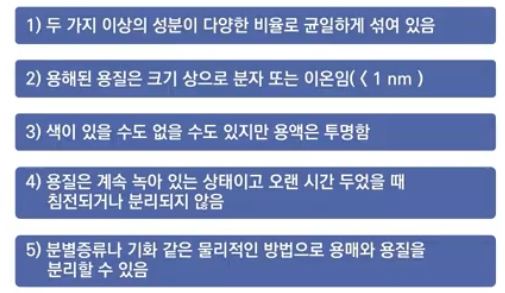 ▣ 용질은 계속 녹아 있는 상태이고 순수한 균일 혼합물이 되기 위해서는 침전이나 분리되면 안된다.