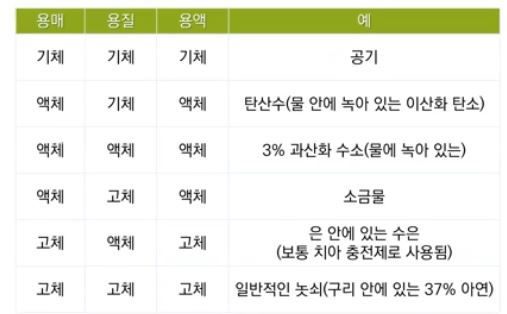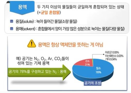 용액은 액체만 뜻하는 것이 아니고 공기 즉 기체도 용액이 될 수 있다.