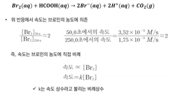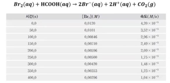 예) 브로민 분자(Br2)와 폼산(포름산, 개미산)(HCOOH)을 반응시켰을 때 25[℃]에서 브