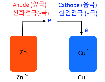 아연판이 구리 처럼 반응성이 다른 금속이온을 이용하여 왼쪽 즉 anode는 산화반응