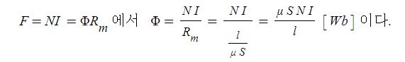 자기회로에서 기자력 F = NI = ΦRm 식이 이었고 이 식에서 다음식이 유도 되었다.