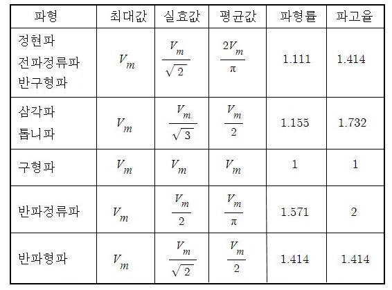 [해설] 파고율 = 최대값 / 실효값, 파형률 = 실효값 / 평균값
